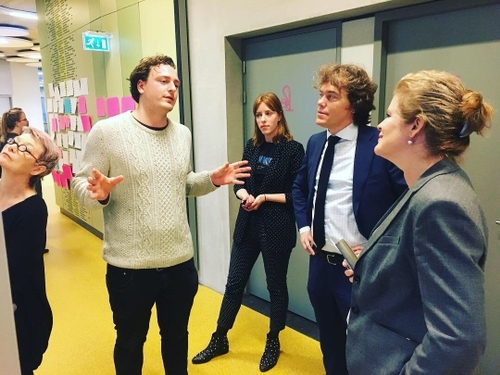 Student Milo die met het gele touw in gesprek gaat met mijn collega's en de directeur-generaal van DUO.